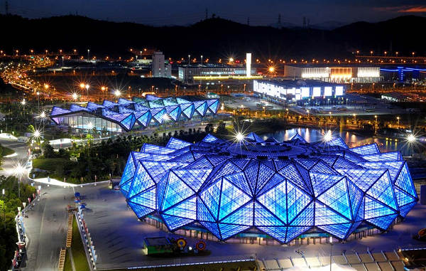 深圳大运中心体育场馆率先在海内体育场馆建设中引入以聚碳酸酯板(PC板)作为屋面质料面板,PC板是一种科技循环利用的高新低碳环保质料,相同厚度只有普通玻璃重量的50%,隔热性能比普通玻璃提高了25%,攻击强度时普通玻璃的250倍,并具有良好的透光性、抗攻击性及耐紫外线辐射性能,同时还具有良好的尺寸稳定性和成型加工系能。
