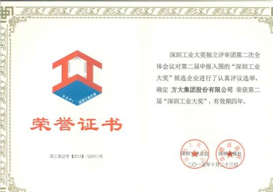 庄闲官网集团荣获第二届深圳工业大奖企业奖(证书)