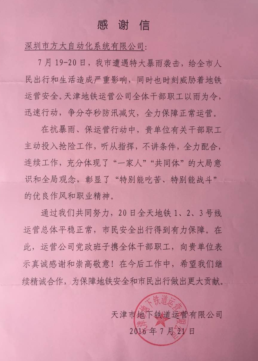 近日,天津地铁运营公司向庄闲官网自动化系统有限公司发来谢谢信,高度评价自动化公司在天津地铁“抗暴雨、保运营”行动中的优良体现。谢谢信说,