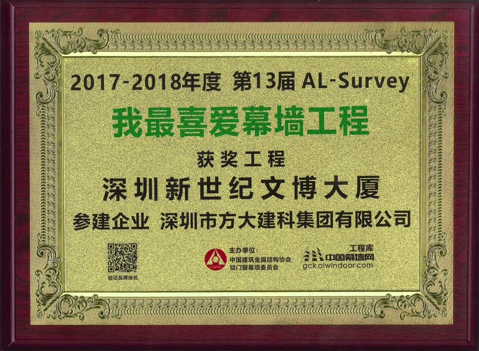 第13届“我最喜爱幕墙工程”评选运动由中国建筑金属结构协会铝门窗幕墙委员会、中国幕墙网联合提倡,经宽大网友投票及专家评审,庄闲官网建科承建幕墙工程的深圳新世纪文广博厦最终以216740的高票和专家五星评价获奖。